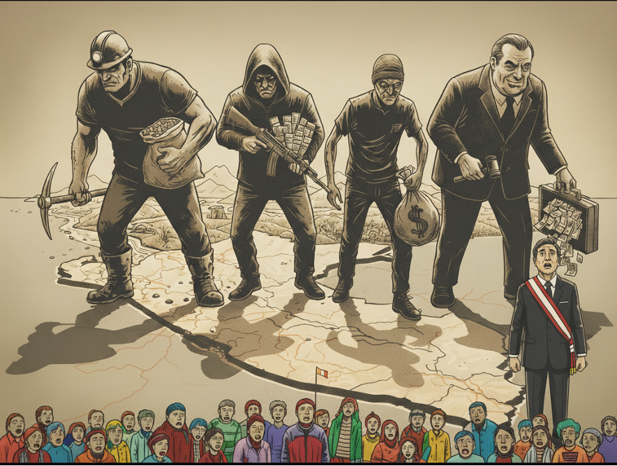 De este modo, el Estado no puede —o no quiere— frenar a los poderes fácticos depredadores: narcotraficantes, mineros ilegales, redes de corrupción, mafias que lucran con los servicios públicos y partidos políticos convertidos en meras plataformas para gestionar intereses privados. En consecuencia, gran parte del Congreso actúa en función de esos mismos intereses ilícitos, blindando privilegios y debilitando la institucionalidad.