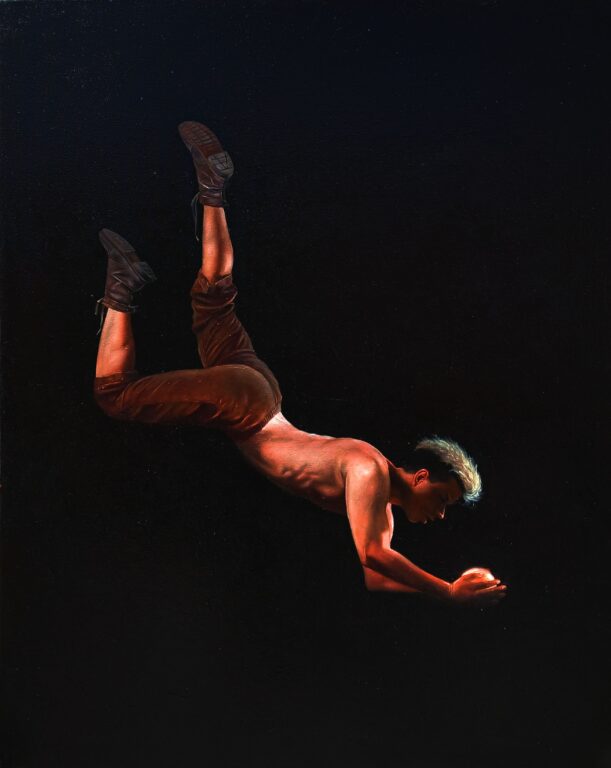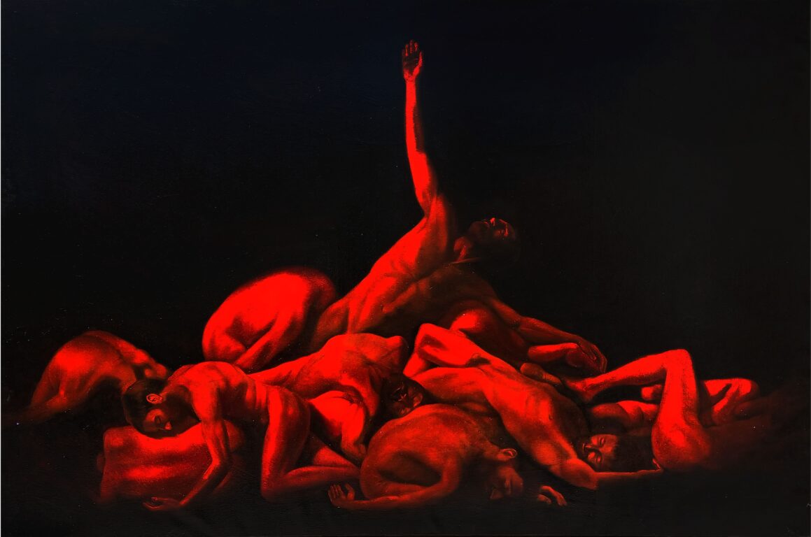 Y el fuego eterno para terminar. En Agnus Dei el pintor asume el riesgo de representar una orgía cuir en medio del infierno. En otro cuadro, formando un díptico, hay otro hombre que cae para unirse a ellos  Y si el momento del Réquiem habla de salvación este cierre pictórico lo que hace es perturbar. Ese cuerpo no se lanza a la salvación. Va a sumarse a los condenados que sólo encuentran la redención a través de su sexualidad. Ignoro si los himnos cristianos también rezarían en este caso : ¡Oh, del gozo!