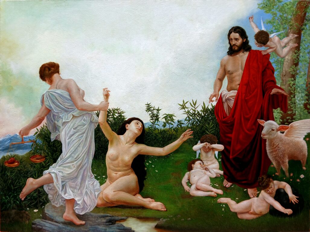 Sólo el cuadro de “Jesús Piadoso”, en el que asume más riesgos, incluye una mujer y junto a ellas elementos derivados del kitsch decimonónico, -digamos Bouguereau- y un cordero alado que, a tono con los postulados posmodernos, añade la indispensable ironía a un cuadro orientado, particularmente, para entendidos.