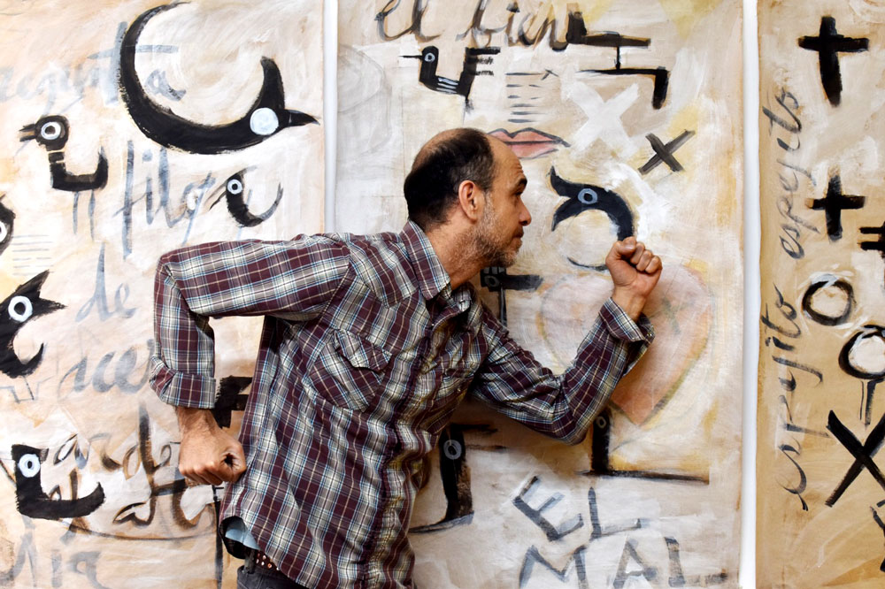 Así, el trazado de sus primeras obras estaría gobernada por espacios concomitantes al cómic, la pintura rupestre y probablemente el art brut. De Orbegoso no solo es un pintor, es un psiconauta que, al tiempo de dibujar, explora las posibilidades del sistema medicinal amazónico. Producto de esto son las 22 pinturas sobre papel que componen “Los cielos de abajo”, una serie de representaciones visuales con las que el artista conjura el periodo más oscuro de su existencia.