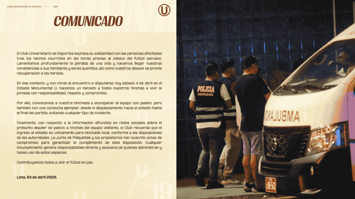 “Universitario expresa su solidaridad con las personas afectadas tras los hechos ocurridos en las horas previas al clásico. Lamentamos profundamente la pérdida de una vida y hacemos llegar nuestras condolencias a sus familiares y seres queridos, así como nuestros deseos de pronta recuperación a los heridos”, señaló la institución.