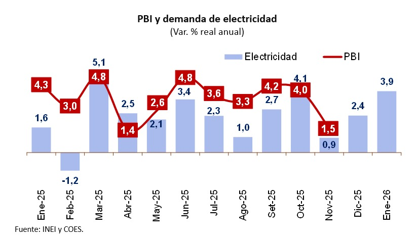 Uno de los principales indicadores que reflejan el desempeño económico es la demanda eléctrica, considerada un termómetro clave de la actividad productiva nacional debido a su alta correlación con el PBI. En enero de 2026, este indicador creció 3,9 % interanual, superando ampliamente los registros de diciembre de 2025 (2,4 %) y noviembre del mismo año (0,9 %).