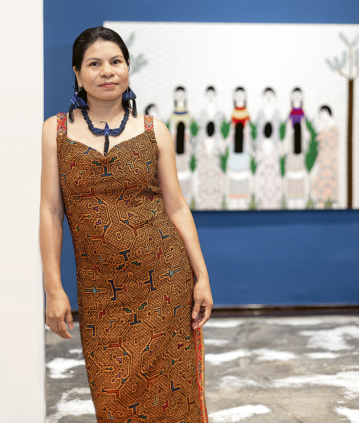Chonon Bensho, artista shipibo-konibo de la Amazonía peruana, ha logrado posicionarse como una figura clave en el arte contemporáneo del país. Su trabajo, que integra saberes ancestrales y modernidad, ha llevado la cosmovisión de su comunidad a importantes escenarios internacionales. Ganadora del Premio Nacional de Pintura del Banco Central de Reserva del Perú en 2022, Bensho destaca por su habilidad para transmitir las narraciones tradicionales shipibo-konibo a través de diversos soportes: pintura, bordado, dibujo, instalación y audiovisual.