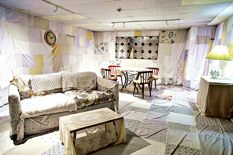 Hay que reconocer el acierto de los premios. Fabiola Gonzáles Condori es muy buena pintora egresada de la PUCP, sin embargo, aquí ha ganado por una instalación en la cual habla de las capas de memoria que forman un hogar, a través de los textiles de uso cotidiano que sobreviven con nosotros. Manteles, sábanas, pañuelos, etc. se integran en tonos casi monocromáticos a modo de un inmenso patchwork que ha registrado el tiempo de quienes lo vivieron. Los fragmentos escritos sobre telas permiten imaginar al inmenso espacio lleno de textos a mano a modo de testimonio de lo que ha tocado vivir a sus ocupantes. Hubiera sido el delirio.