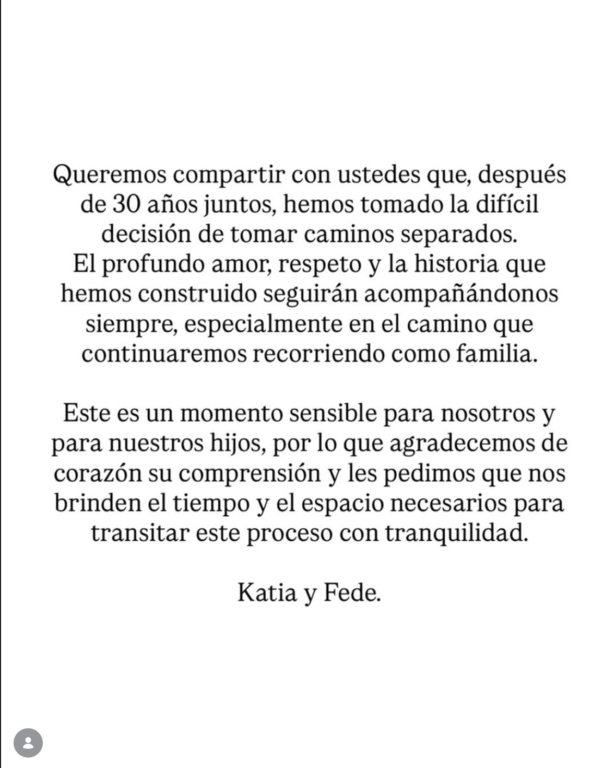 En el comunicado, ambos solicitaron comprensión y privacidad para atravesar el proceso junto a sus hijos, en un momento que describieron como difícil a nivel personal.