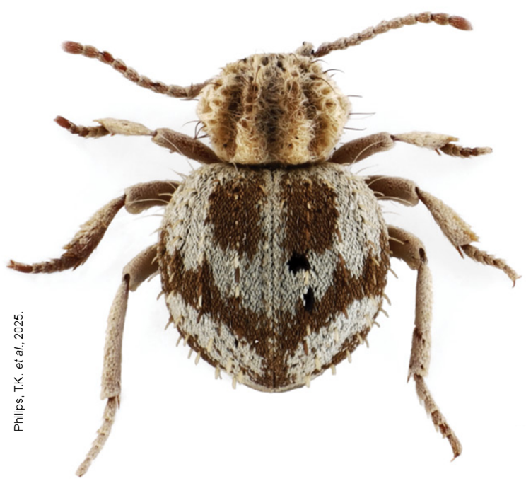 Los escarabajos del género Trigonogenius son conocidos como “escarabajos araña” debido a su apariencia globosa y sus patas relativamente largas. En el caso de esta nueva especie, los investigadores identificaron características distintivas como surcos longitudinales muy marcados en el pronoto —la parte superior del tórax— y patrones específicos en los élitros, que son las alas endurecidas que protegen el cuerpo del insecto.