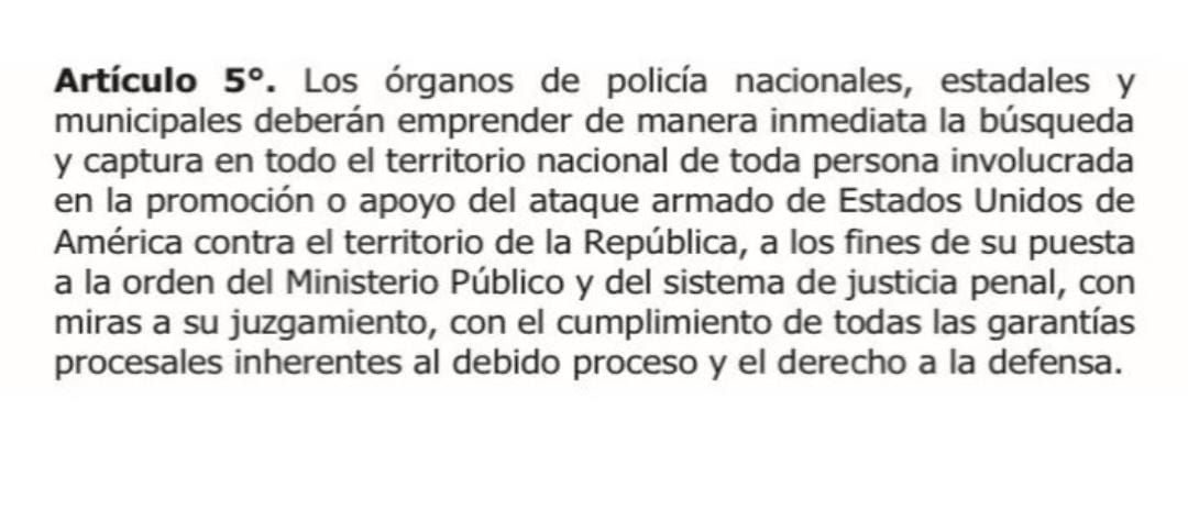 Una de las principales disposiciones del decreto es la instrucción a los cuerpos de seguridad para que actúen contra quienes se perciban como colaboradores de la intervención estadounidense. El texto establece que “los órganos de policía nacionales, estadales y municipales deberán emprender de manera inmediata la búsqueda y captura en todo el territorio nacional de toda persona involucrada en la promoción o apoyo del ataque armado de Estados Unidos”.