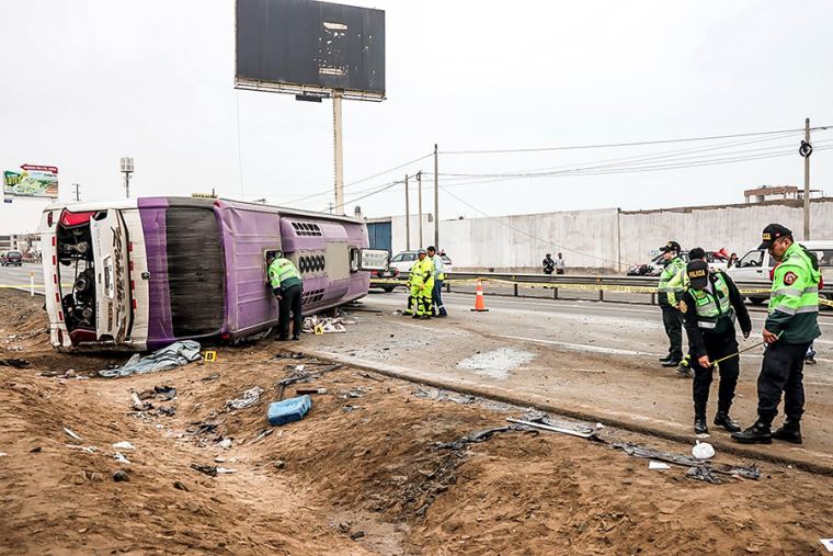 La volcadura de un bus a la altura del kilómetro 34 de la Panamericana Sur en Lurín, ha dejado como saldo cuatro pasajeros fallecidos y 22 heridos.