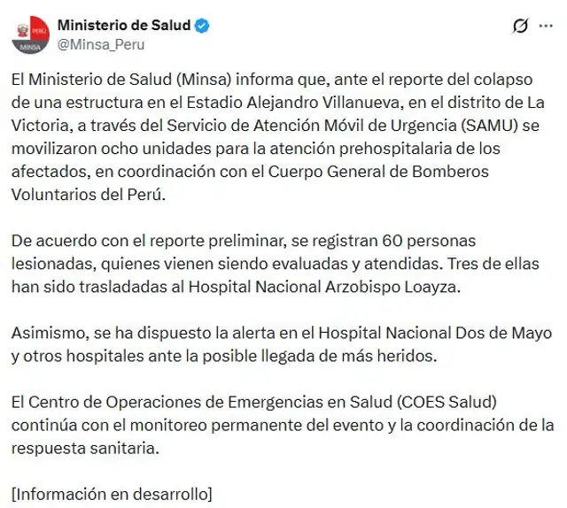 El primer balance reportó alrededor de 60 personas lesionadas, varias de las cuales fueron trasladadas a hospitales como el Arzobispo Loayza y el Dos de Mayo.