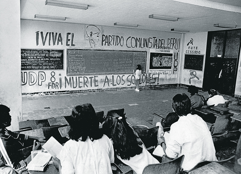 La Universidad Nacional Mayor de San Marcos, entonces bastión de la educación pública, también estaba sitiada por el deterioro. En mayo, una fotografía de CARETAS mostraba a los estudiantes asistiendo a clases en medio de pintas senderistas.