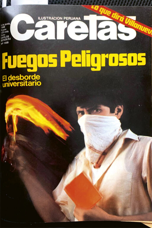 El pie de foto era demoledor: “La terrible fotografía que aparece en estas páginas patentiza una de las calamidades del Perú: la forma como el terrorismo ha penetrado en nuestra universidad principal, a punto tal que los estudiantes deben seguir sus clases en medio de pintas infamantes. San Marcos, en mucho, refleja la situación total del Perú”.