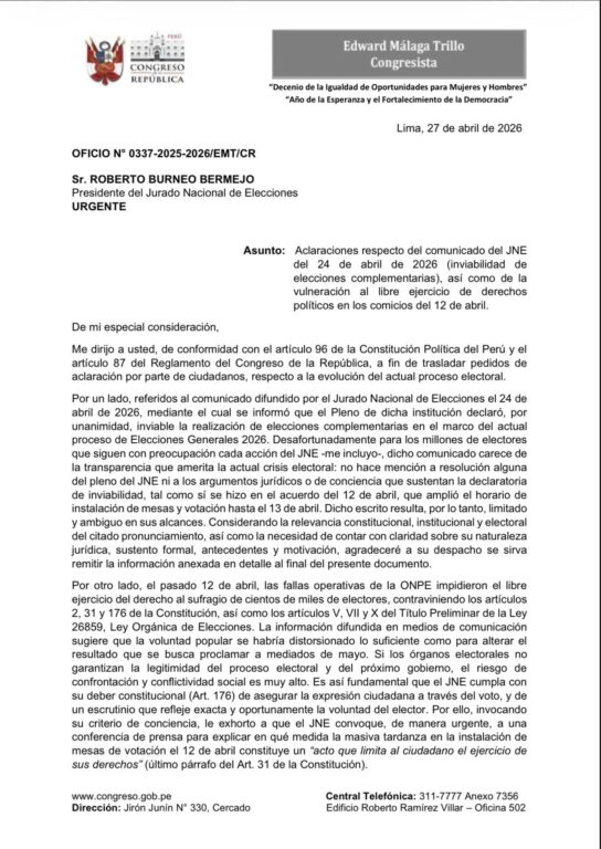 El congresista Edward Málaga está haciendo un llamado a la transparencia al Jurado Nacional de Elecciones (JNE), liderado por Roberto Burneo. En un contexto de creciente preocupación electoral, ha solicitado explicaciones sobre la decisión de considerar inviables las elecciones complementarias. Esta decisión está relacionada con los hechos ocurridos el pasado 12 de abril durante las elecciones generales, donde numerosos votantes no pudieron ejercer su derecho al sufragio.