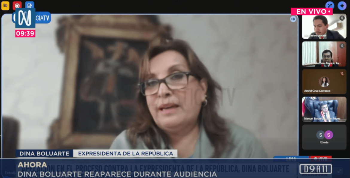 Boluarte pidió disculpas y argumentó que la imagen del juez aparecía reducida en su pantalla. Luján le pidió mayor atención y recordó que en audiencias virtuales es obligatorio mantener visible a la autoridad que dirige la sesión.