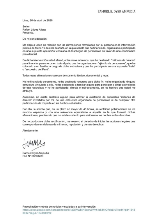 El candidato presidencial Rafael López Aliaga lanzó polémicas acusaciones contra el empresario Samuel Dyer Ampudia, a quien señaló como parte de un supuesto fraude electoral. Horas después, el aludido respondió con una carta notarial exigiendo rectificación.