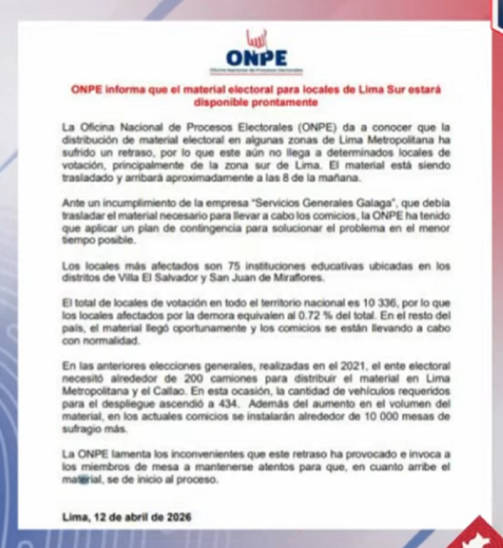 ONPE lanzó un comunicado tras los reportes en diferentes centros de votación en Lima Sur y otros puntos de la ciudad sobre la falta de material electoral y el retraso del proceso en estas votaciones generales 2026.