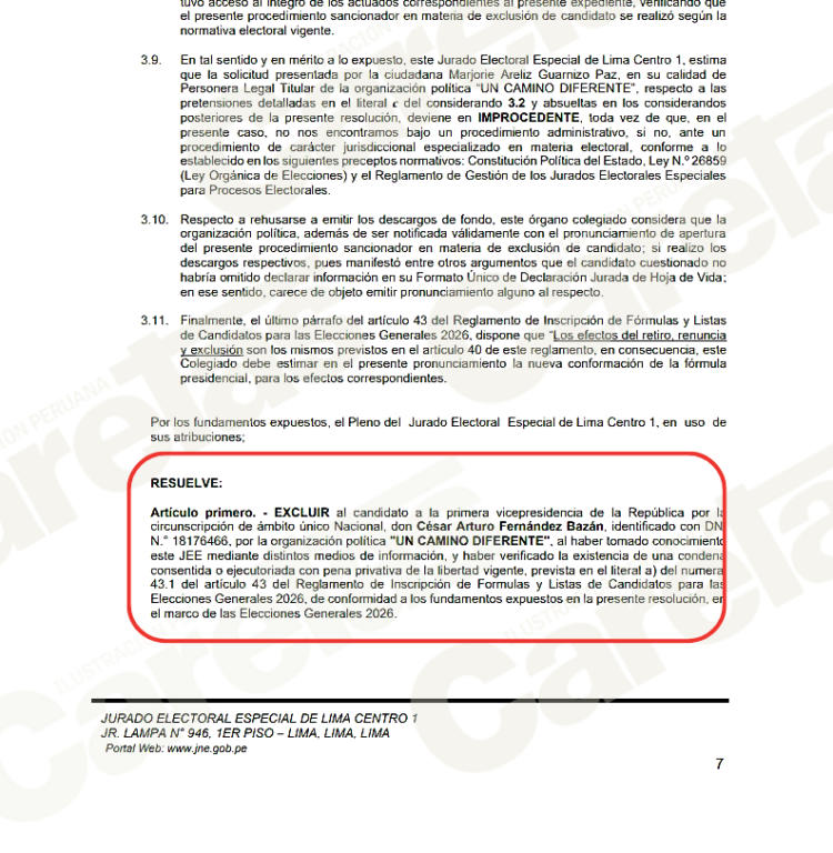El Jurado Electoral Especial de Lima Centro 1 excluyó a César Arturo Fernández Bazán del proceso electoral luego de verificar que cuenta con una condena firme por el delito de difamación agravada, la cual incluye pena privativa de libertad y se encuentra vigente.