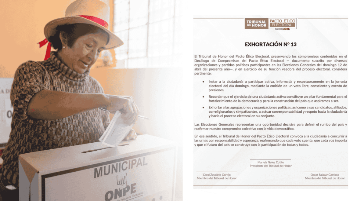 El Tribunal de Honor del Pacto Ético Electoral publicó la Exhortación N° 13, un documento que marca la pauta de conducta para el tramo final de las elecciones Perú 2026. El pronunciamiento oficial insta a la ciudadanía a participar de manera activa y respetuosa, pero pone especial énfasis en el comportamiento de las agrupaciones políticas en un escenario marcado por la polarización y las críticas cruzadas entre los aspirantes al sillón de Pizarro.
