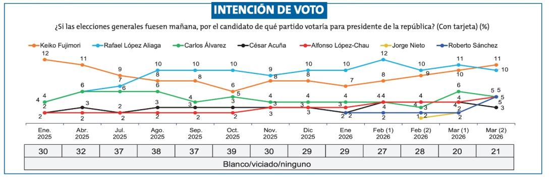 Los candidatos Fujimori y López Aliaga se mantienen al frente de la intención de voto en el Perú, de acuerdo con la más reciente encuesta de Ipsos, que ubica a Keiko Fujimori con 11% y a Rafael López Aliaga con 10%, en una contienda marcada por la dispersión del electorado.