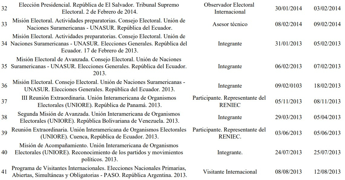También registra misiones similares en Ecuador, Colombia, Paraguay, República Dominicana, Bolivia, Panamá, Uruguay, El Salvador y Argentina, entre otros países, como observador internacional, asesor técnico o representante del Reniec.