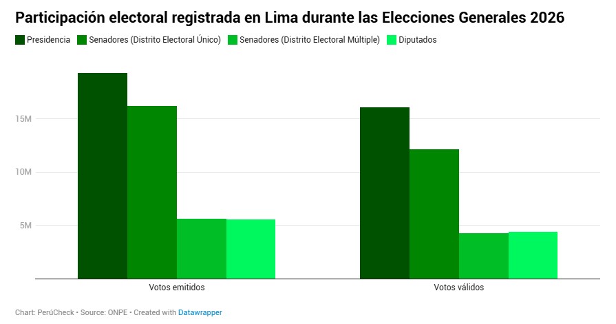Sin embargo, los resultados oficiales de la Oficina Nacional de Procesos Electorales (ONPE) muestran que sí hubo una participación masiva de electores en Lima durante las Elecciones Generales 2026. Sí hubo, sin embargo, una crisis de sufragio en distritos del sur de Lima, donde las mesas de votación no llegaron a abrirse el domingo 12 de abril, por lo que las elecciones tuvieron que extenderse, en estos distritos, al día siguiente. En otros lugares del país, mesas de votación se abrieron con horas de retraso.
