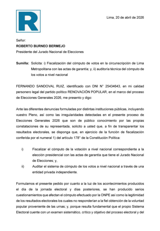 El partido Renovación Popular presentó un pedido formal ante el Jurado Nacional de Elecciones (JNE) para que se realice una auditoría al sistema de cómputo de votos a nivel nacional mediante una entidad privada independiente, en el marco de las Elecciones Generales 2026.