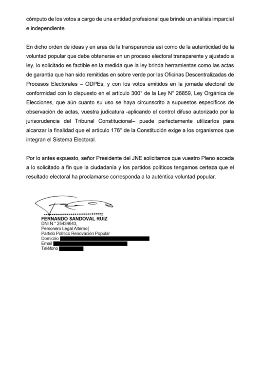 El requerimiento fue ingresado el 20 de abril por el personero legal Fernando Sandoval Ruiz, quien cuestionó la legitimidad de los resultados procesados por la Oficina Nacional de Procesos Electorales (ONPE). Según el documento, la agrupación advierte “serios cuestionamientos” que pondrían en duda la fidelidad de la voluntad popular expresada en las urnas.