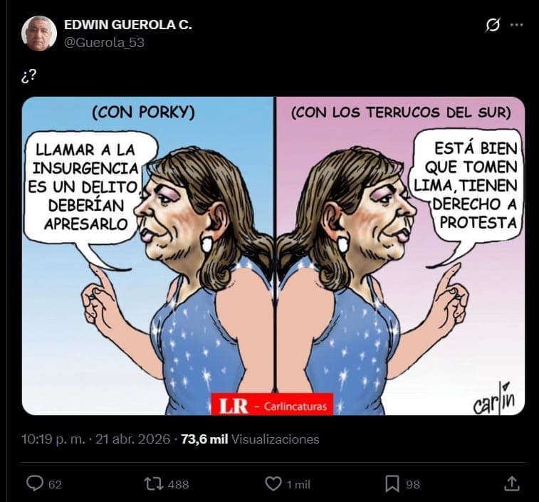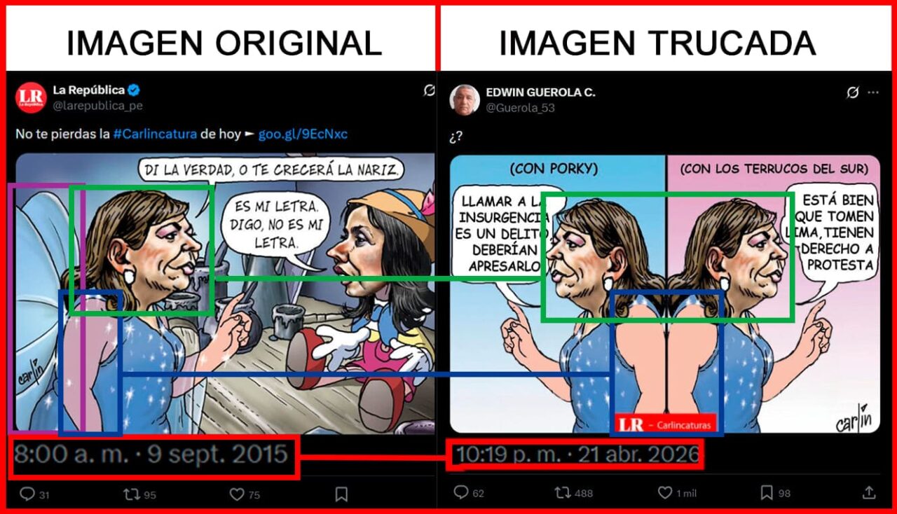 La gráfica ha sido difundida por Edwin Guerola y lleva la firma tradicional de ‘Carlín’, así como el cintillo de su sección en el diario La República: “Carlincaturas”. A la fecha, acumula más de 1,000 likes y casi 500 reposteosSin embargo, se trata de una imagen trucada que usa partes de caricaturas pasadas de ‘Carlín’ para parecer auténtica.