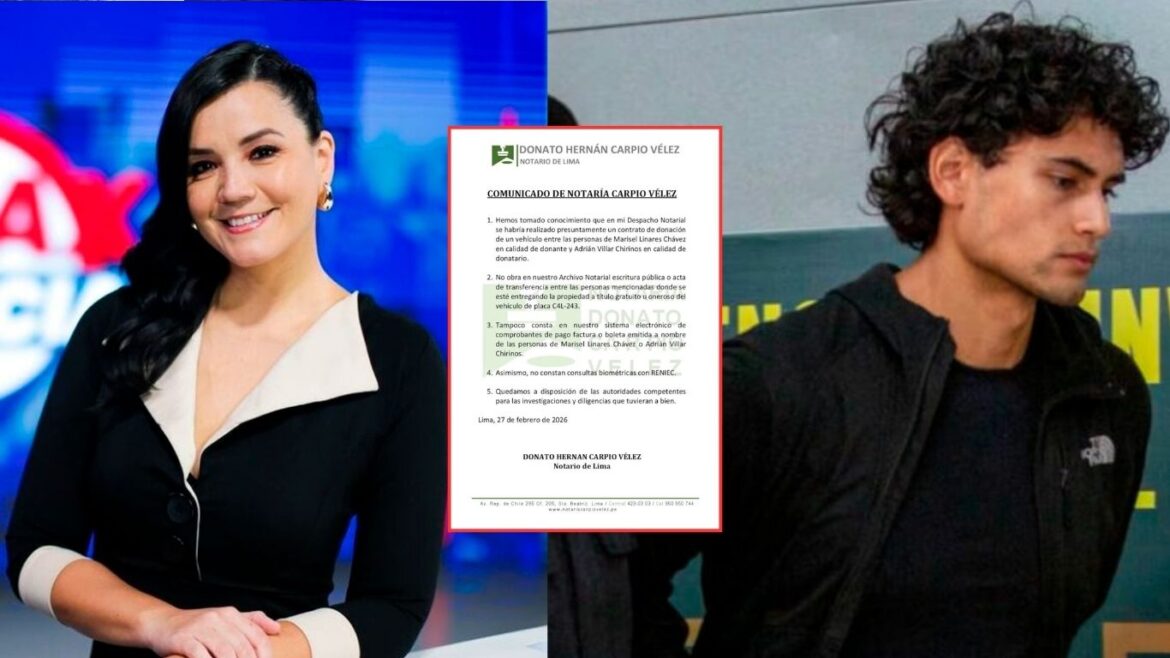 La Notaría Carpio Vélez emitió un comunicado oficial este 27 de febrero de 2026 para desmentir la realización de cualquier trámite relacionado con una presunta donación de vehículo entre la periodista Marisel Linares Chávez y el investigado Adrián Villar Chirinos. El pronunciamiento surge tras versiones que señalaban a dicha oficina como el lugar donde se habría formalizado la entrega de la propiedad del auto de placa C4L-243, el mismo que acabó con la vida de la deportista Lizeth Marzano en San Isidro.